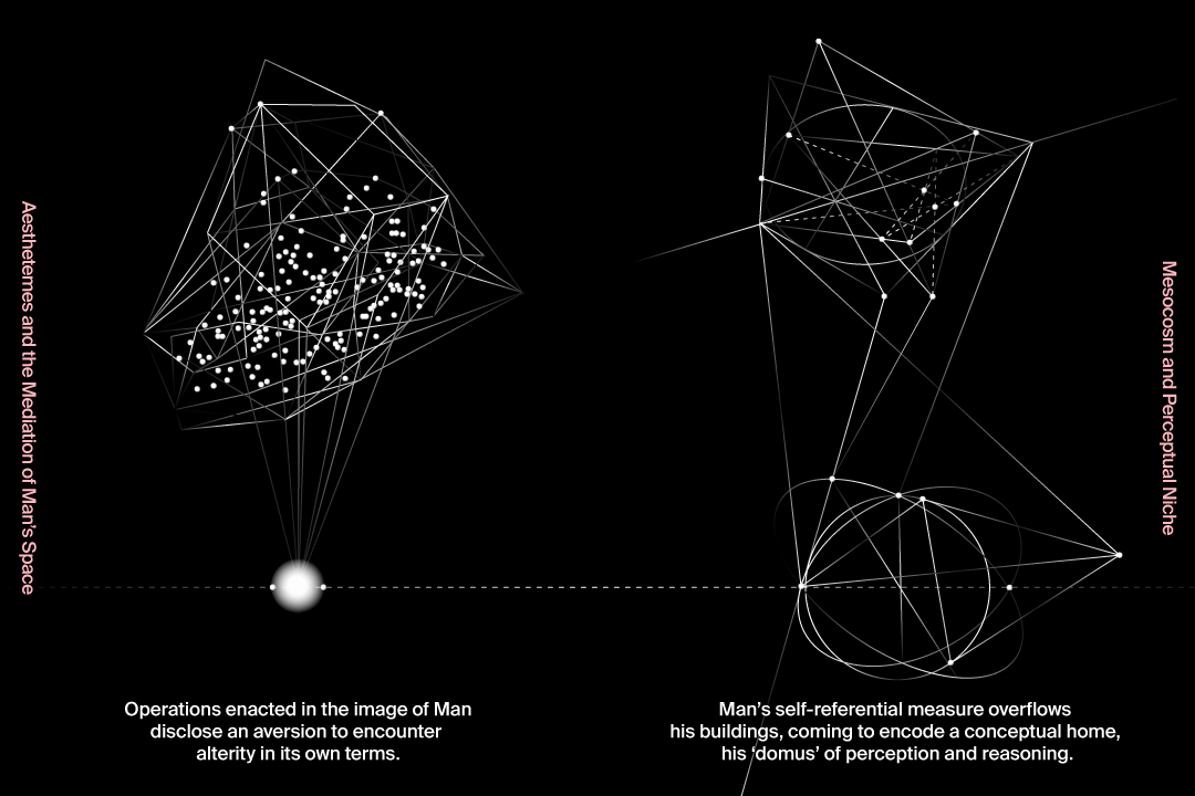Dit contextuele onderzoek, dat kan worden beschreven als een meta-opgave, ondersteunt de communicatie van de belangen en parameters van onderwijsinitiatieven die verankerd zijn in de ecosociale crises van onze tijd zonder te vervallen in naïef optimisme of apocalyptisch fatalisme. Het zet aan tot een bescheiden, maar praktische verkenning van de manieren waarop we ons verhouden tot ruimtelijk inzicht en dit naar buiten brengen om de verwevenheid van relaties op zichzelf te configureren binnen een planetair geconditioneerde praktijk die door het menselijke ruimtelijke denken wordt belemmerd. Door de aandacht te richten op de functie van ruimtelijke medianten en op de manier waarop zij verhalen ‘van buiten de mens’ op verschillende schalen van tijd en ruimte versterken, verschuift de urgentie van verlammende melancholie naar experimenteerbereidheid. Het experiment gaat uit van een opschorting van de perspectivische coördinaten die de ‘oriëntatie’ en ‘zintuiglijke clichés’ van de mens hebben georiënteerd – om met wiskundige en filosoof Gilles Châtelet te spreken, door wiens werk de titel van dit onderzoek is geïnspireerd.